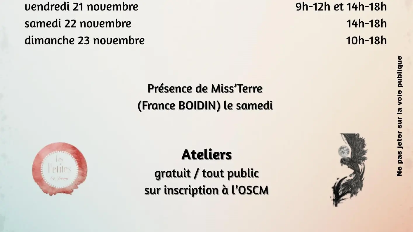 L’exposition sera enrichie par des ateliers gratuits, ouverts à tous et sur inscription (dès à présent à l’accueil de l’OSCM ou sur place le jour J) :