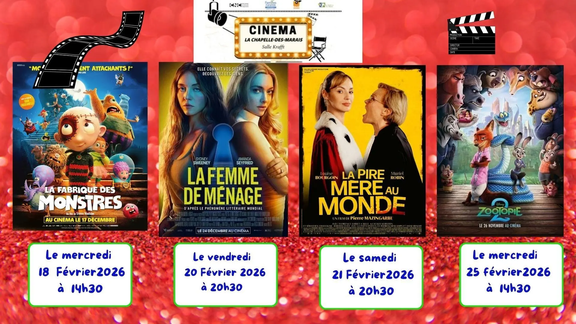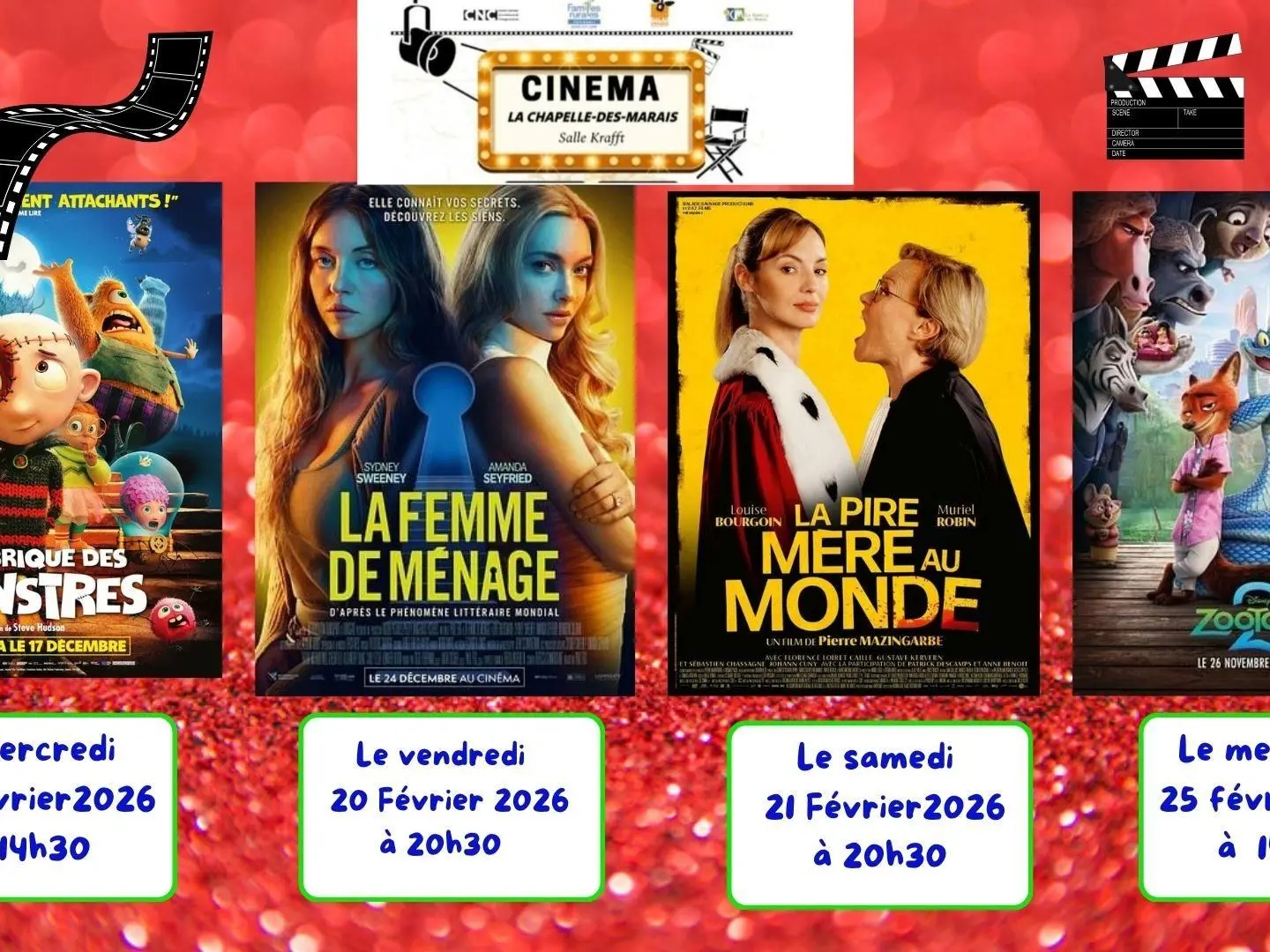 Mercredi : La fabrique des montres; vendredi : La femme de ménage ; samedi : La pire mère au monde ». Mercredi 25 février : Zootopie.