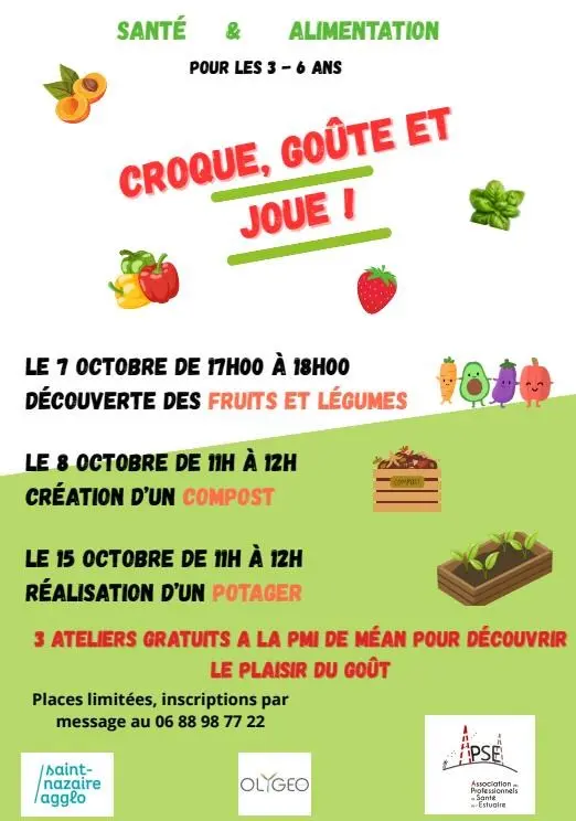 Mercredi 15 octobre 2025 de 11h00 à 12h00. PMI, 110, rue de Trignac, Saint-Nazaire. Gratuit. Inscription avant le vendredi 3 octobre. Contact : 0688987722, [email protected], http://msp-estuaire.site-sante.fr/.
