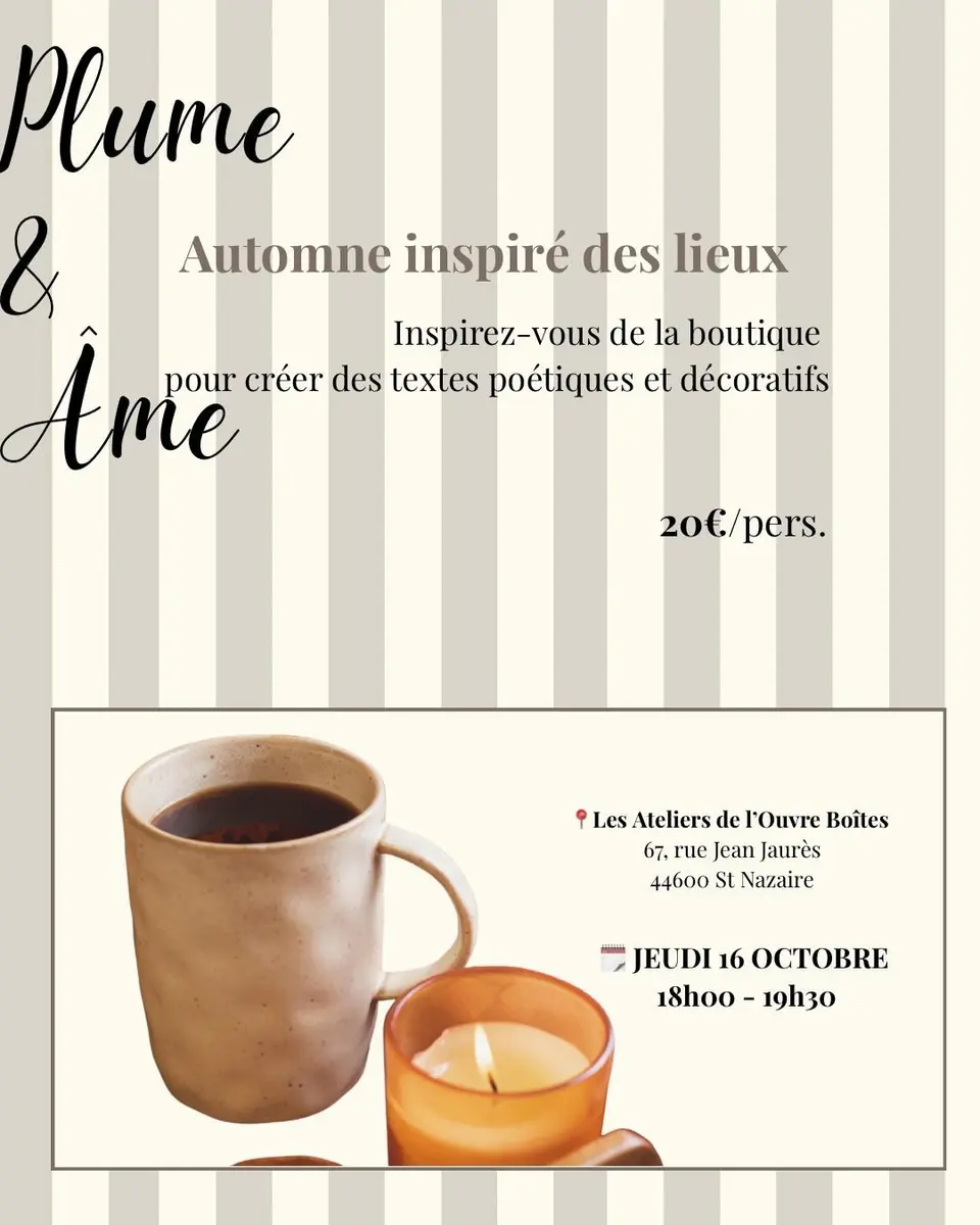 Jeudi 16 octobre 2025 de 18h00 à 19h30. Les ateliers de l'Ouvre-Boîtes, 67, rue Jean Jaurès, Saint-Nazaire. Tarif 20€. Inscription avant le mercredi 15 octobre. Contact : 0667037968, [email protected].