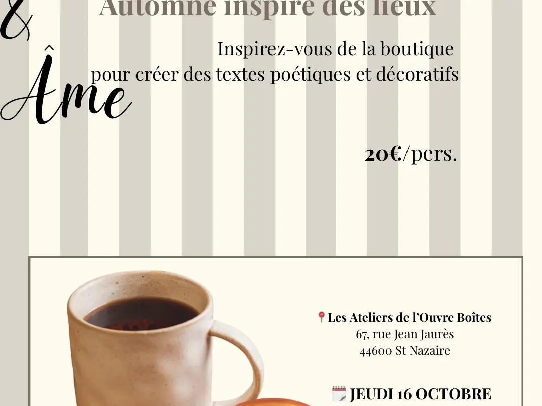 Un atelier où l'écriture créative rencontre l'art-thérapie appliquée aux matériaux que propose la boutique : tissus, fils, couleurs et objets décoratifs. On s'inspire de l'automne pour créer à la fois des textes et des objets poétiques ou décoratifs.
