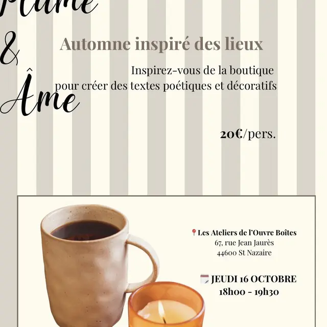 Jeudi 16 octobre 2025 de 18h00 à 19h30. Les ateliers de l'Ouvre-Boîtes, 67, rue Jean Jaurès, Saint-Nazaire. Tarif 20€. Inscription avant le mercredi 15 octobre. Contact : 0667037968, [email protected].
