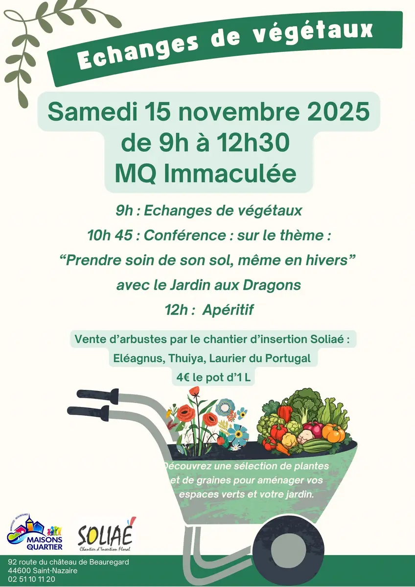 Samedi 15 novembre 2025 de 09h00 à 12h30. 92, route du Château-de-Beauregard, Saint-Nazaire. Gratuit. Contact : 0251101120, [email protected].