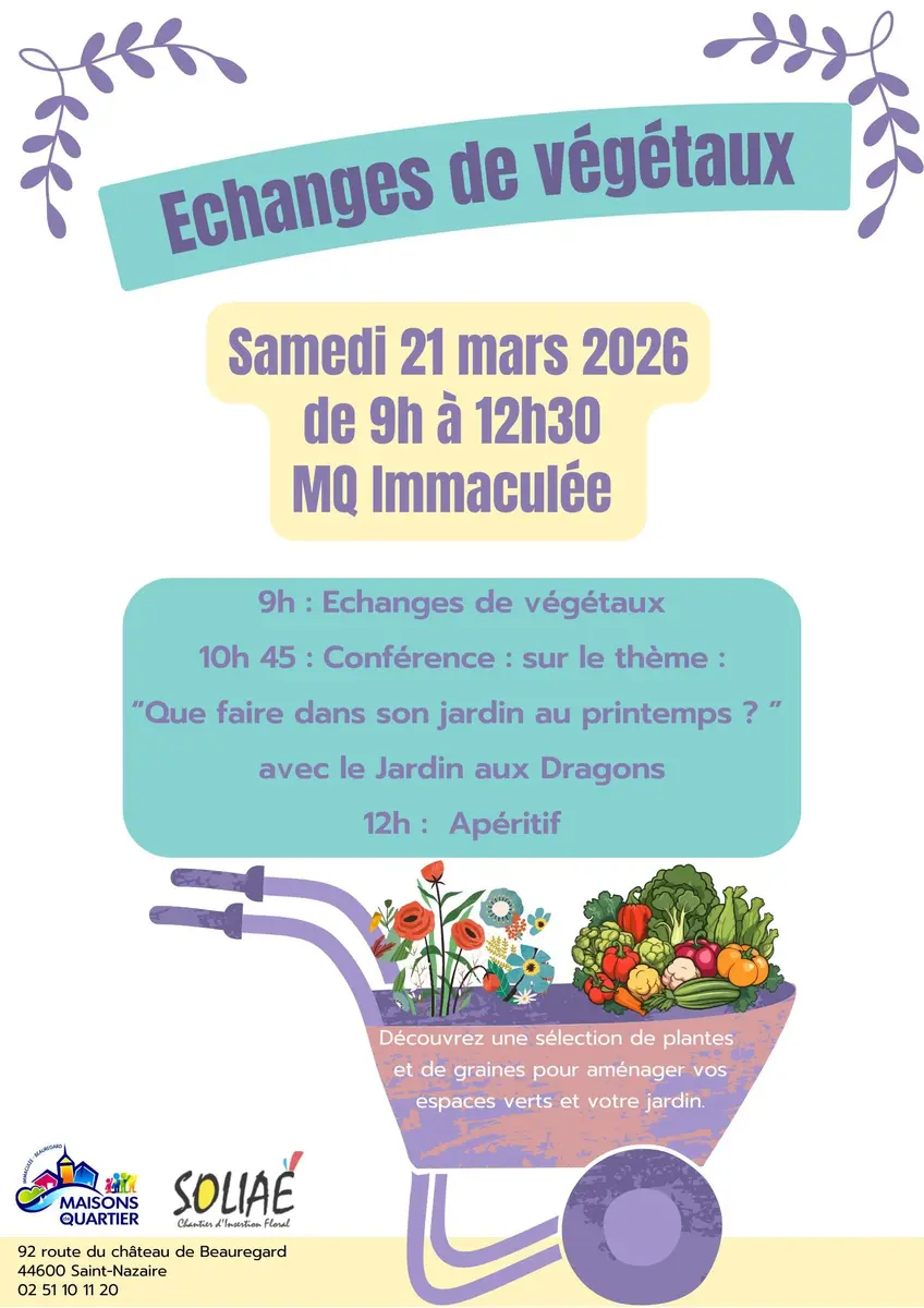 Samedi 21 mars 2026 de 09h00 à 12h30. Maison de quartier Immaculée Beauregard, 92, route du Château-de-Beauregard, Saint-Nazaire. Gratuit. Contact : 0251101120, [email protected].