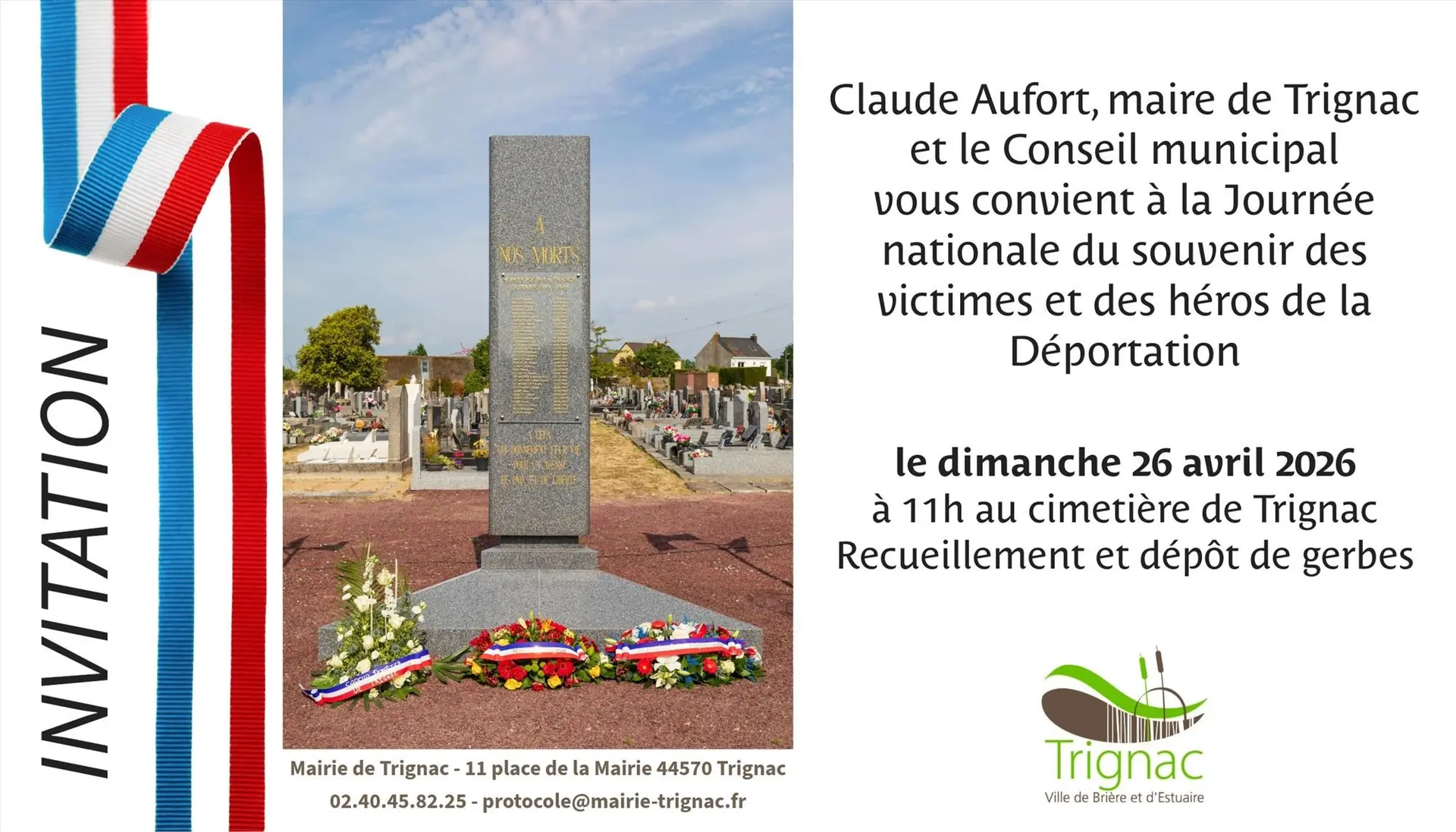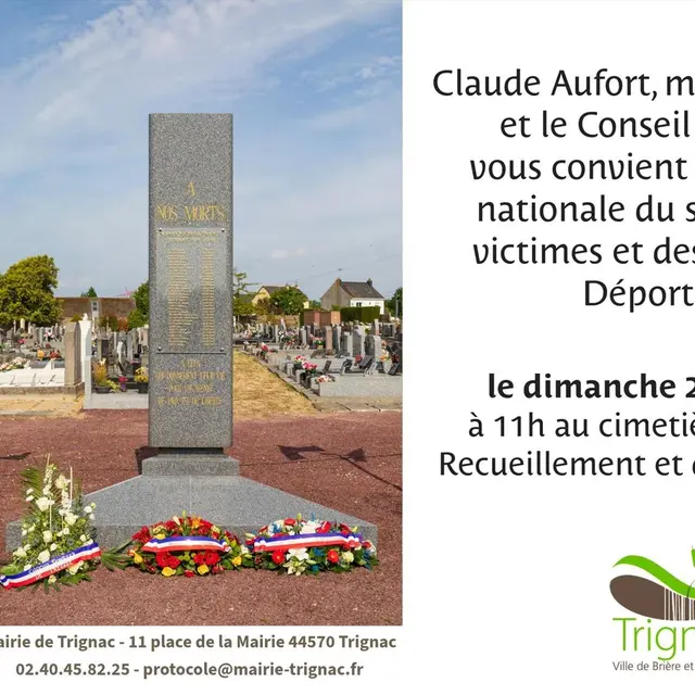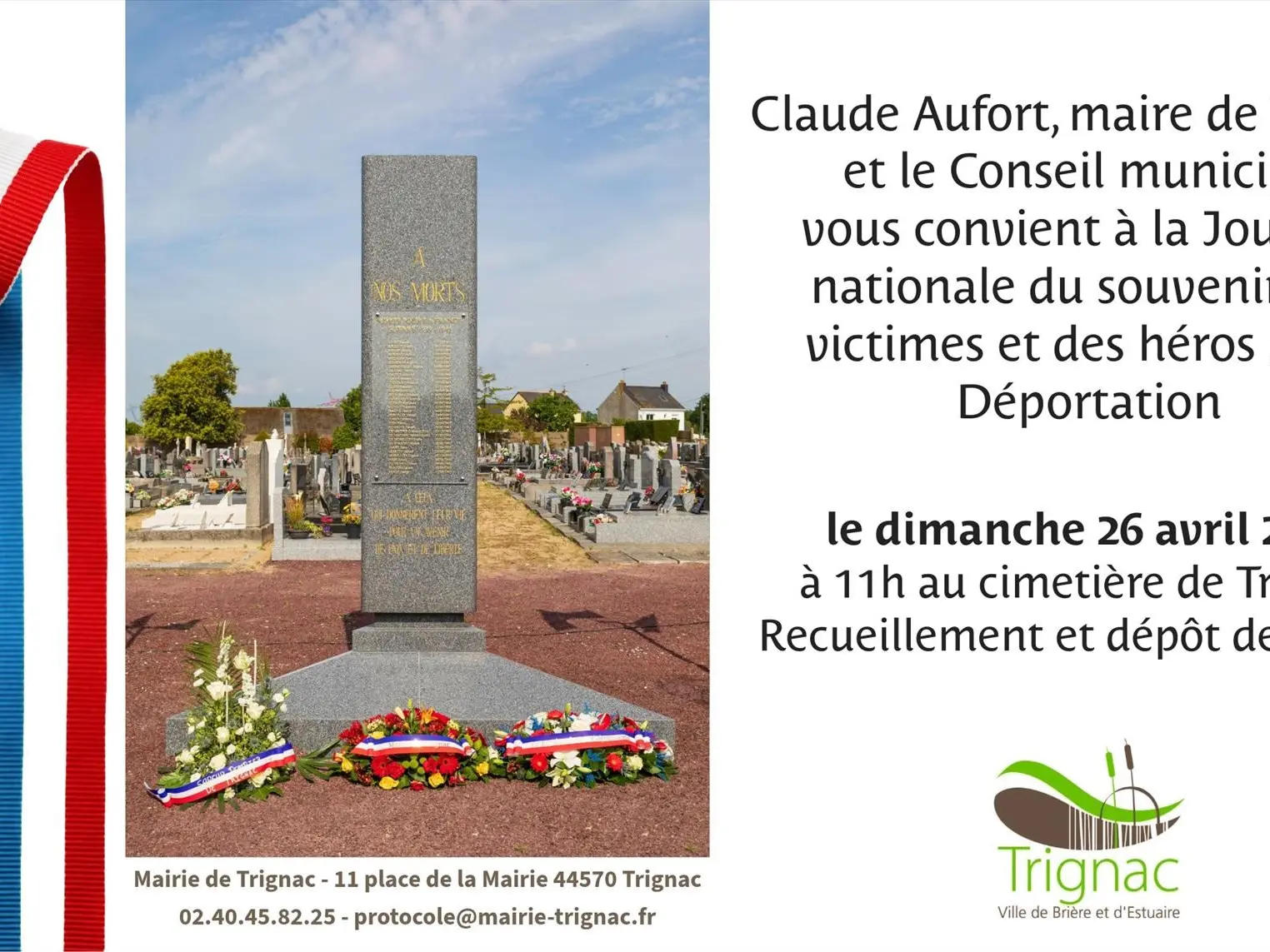 Claude Aufort, maire de Trignac, et le conseil municipal vous convient à la Journée nationale du souvenir des victimes et des héros de la Déportation. Recueillement et dépôt de gerbes.
