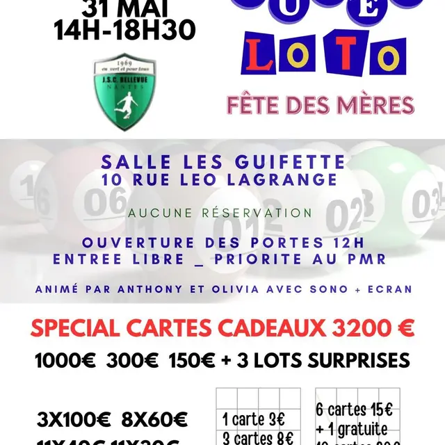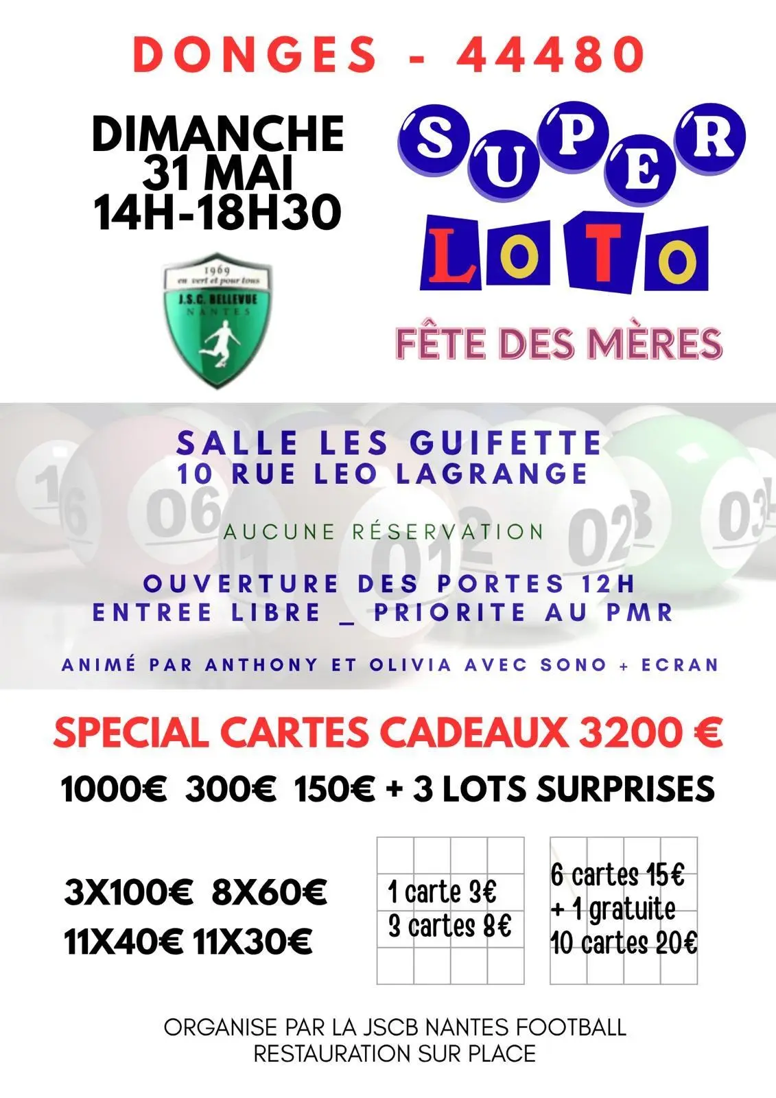Organisé par la JSCB Nantes football. Spéciale cartes cadeaux : 3 200 € 1 000 € - 300 € - 150 € - 3 x 100 € - 8 x 60 € - 11 x 40 € - 11 x 30 € + 3 lots surprises. Sans réservation, grand parking. Capacité de la salle 490 personnes environs. Restauration sur place. Ouverture des portes 12 h, début du loto 14 h.