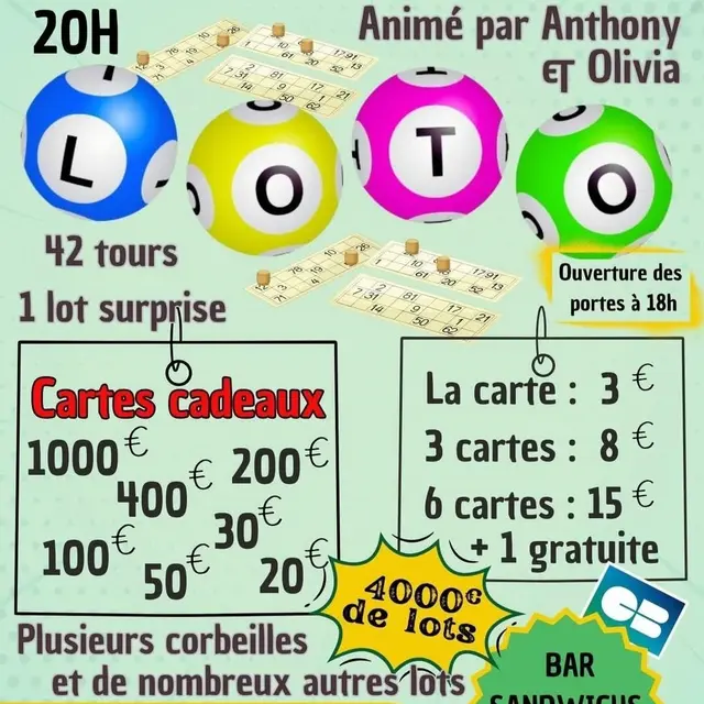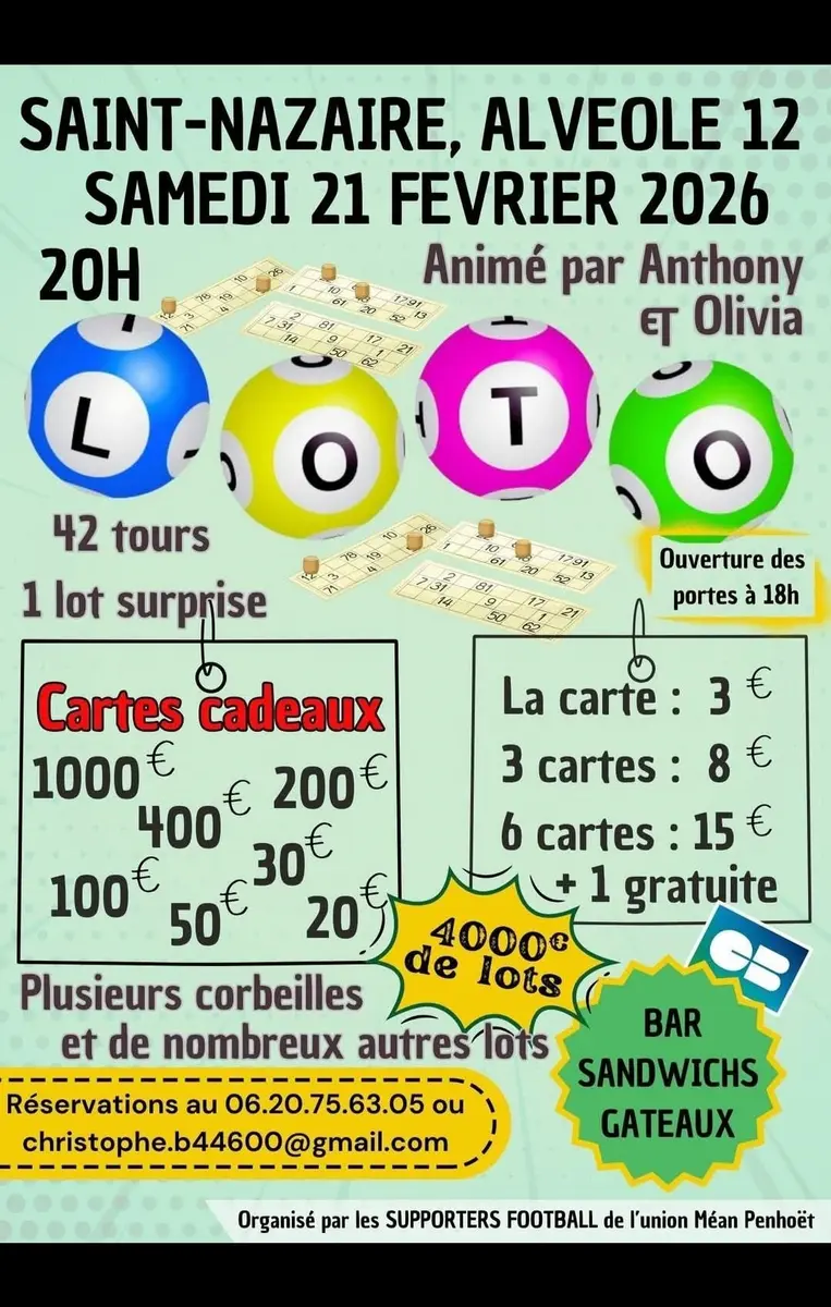 Les supporters foot du club l’UMP, organise un loto le samedi 21 février à 20 h, animé par Anthony et Olivia. Ouverture des portes dès 18 h. De nombreux lots à gagner dont des bons d’achat de 1 000 €, 400 €, 200 €, 100 €, + plein d’autres lots. Il y aura également un lot surprise. Sandwichs, gâteaux, ainsi qu’une buvette seront sur place.