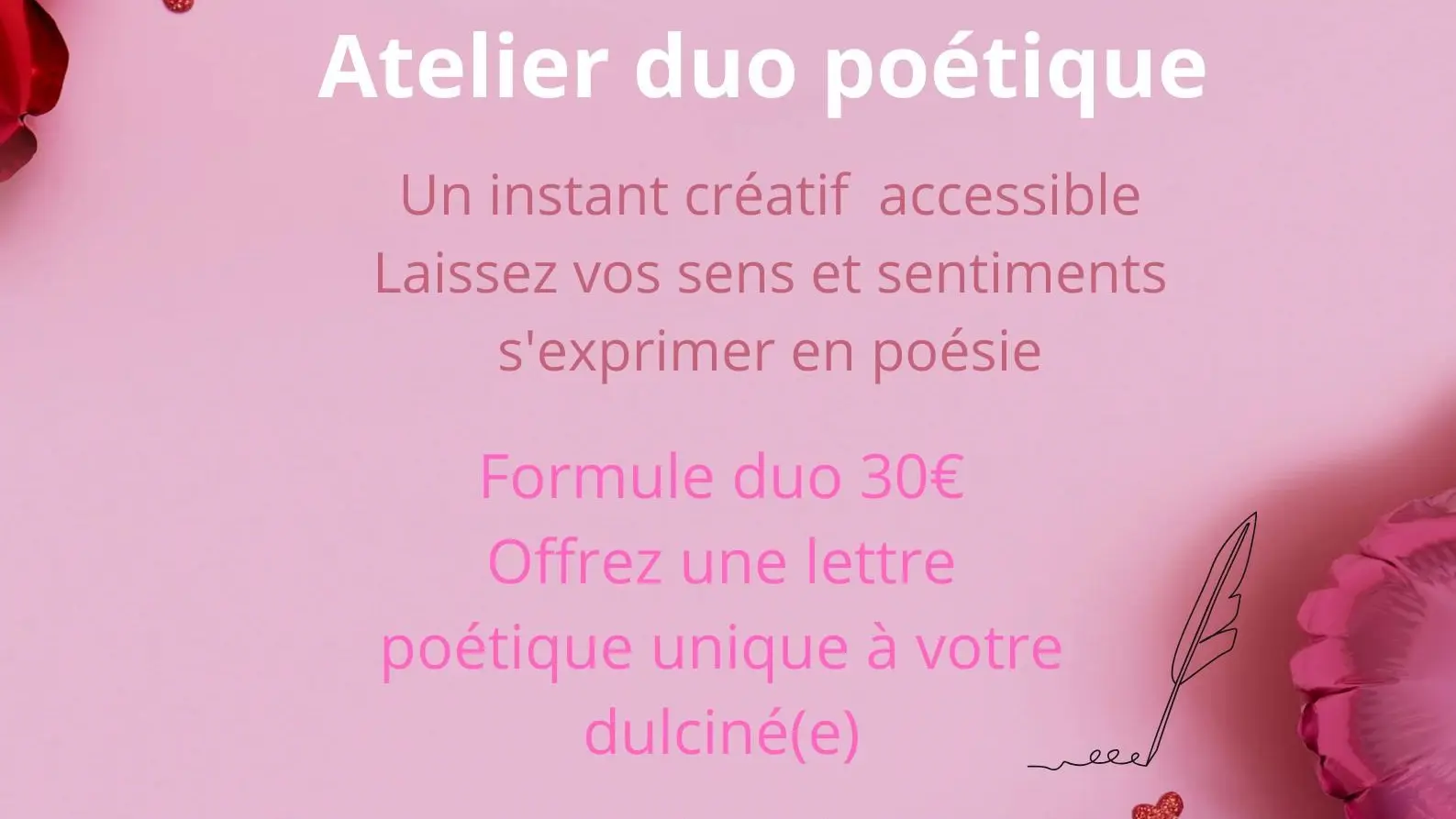 Ambiance feutrée. Laissez vos papilles s’éveiller par l’offre gustative tout en vivant une expérience unique d’écriture poétique avec votre amoureux.euse. Un instant doux, délicat. Vos sens, et sentiments s’expriment avec fluidité, et créativité. Un cheminement accessible pour tous et toutes. Offrez une lettre poétique unique vibrant votre personnalité à votre dulciné.e.