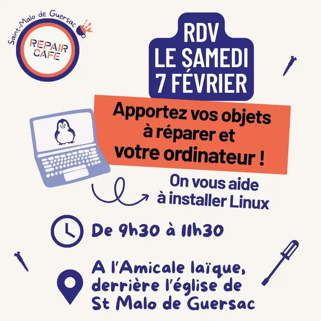 Samedi 7 février 2026 de 09h30 à 11h30. Amicale laïque (derrière l'église), Place de l'Église, Saint-Malo-de-Guersac. Gratuit. Contact : [email protected], https://www.instagram.com/repaircafesmg/.
