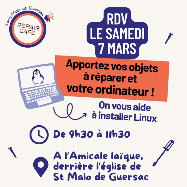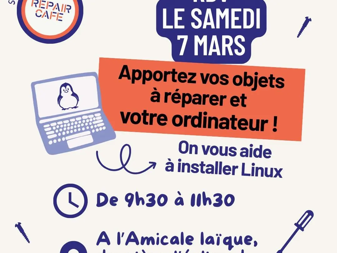 Apportez également votre ordinateur, on vous aidera à installer Linux (places limitées, nous contacter par mail).