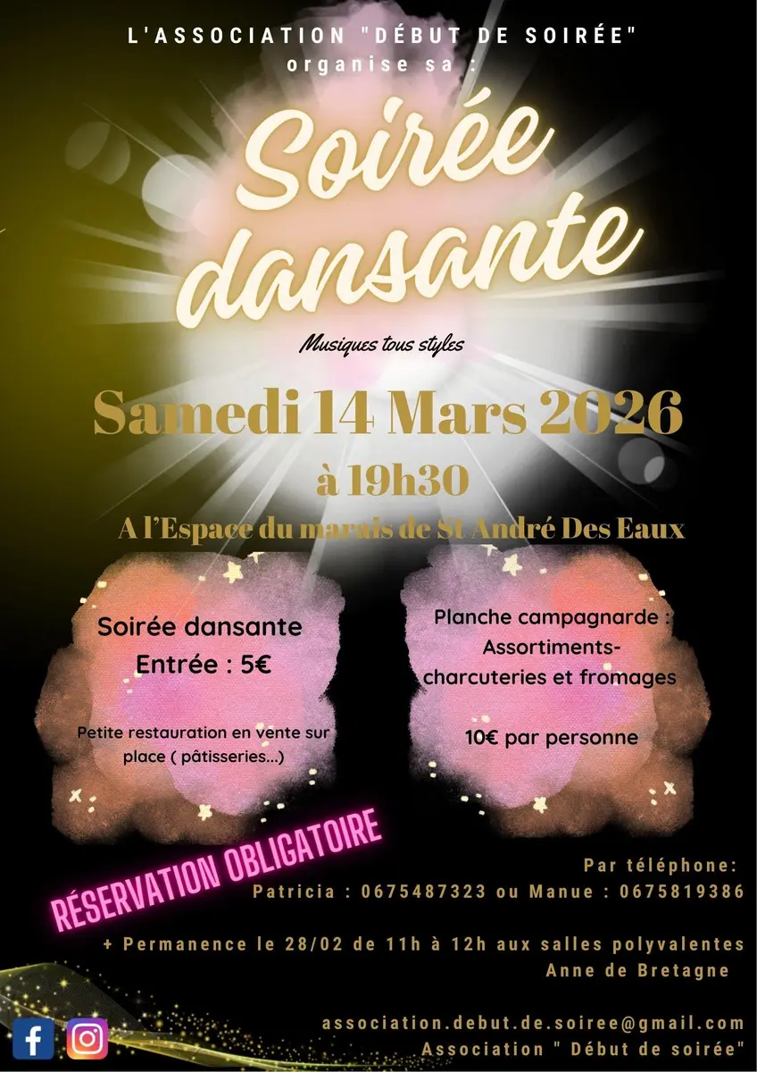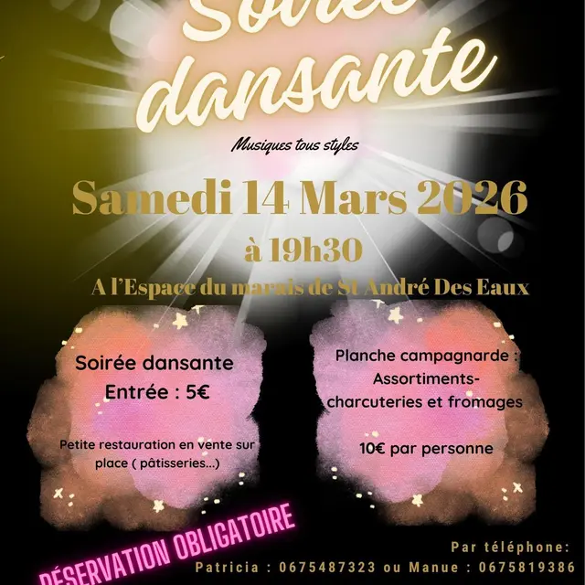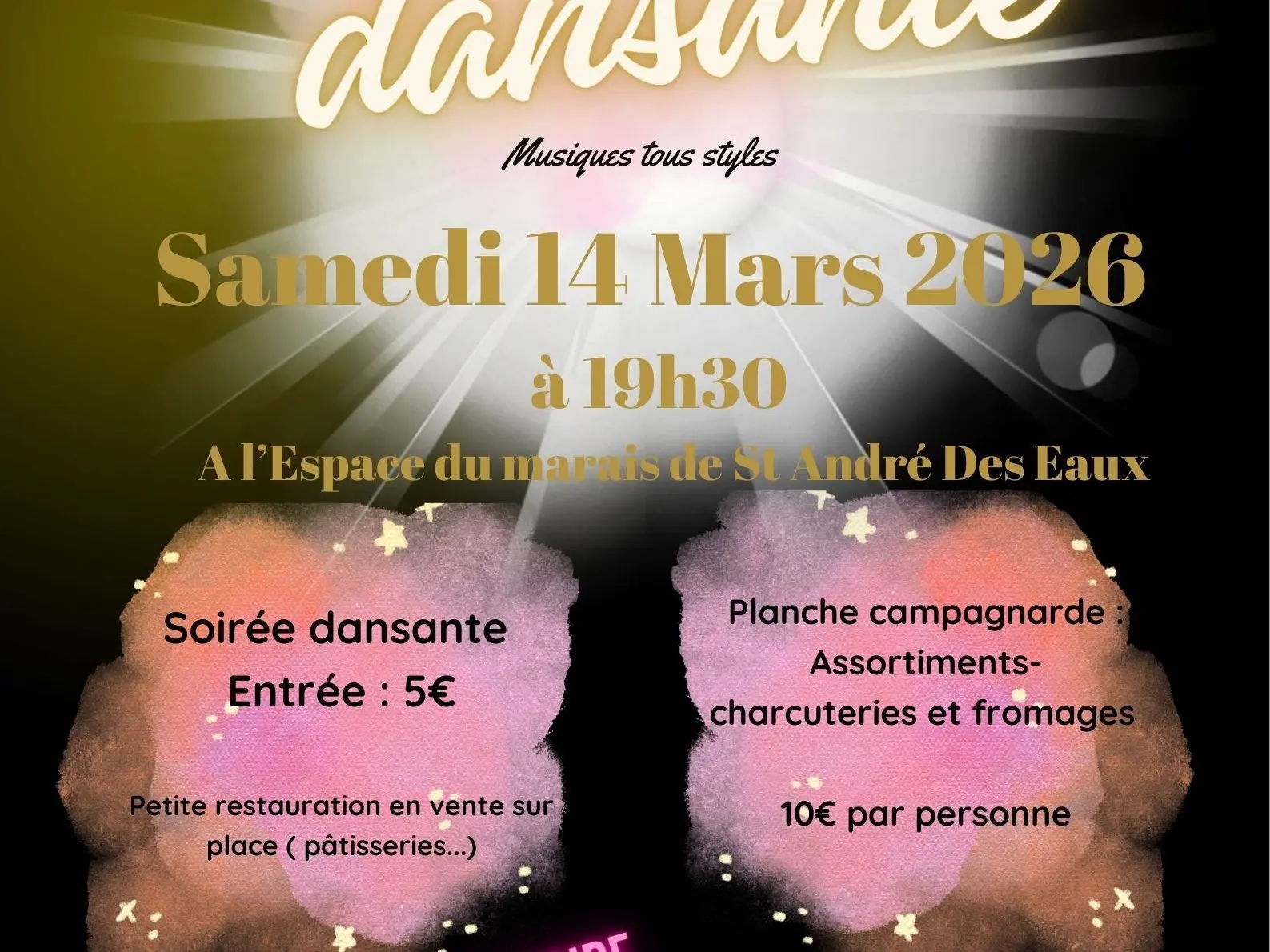 Samedi 14 mars 2026 de 19h30 à 00h00. Espace du marais, 26, rue du marais, Saint-André-des-Eaux. Tarif : Avec planches campagnardes 15€, Soirée seule 5€. Inscription avant le lundi 2 mars. Contact : 0675487323, 0675819386, [email protected].