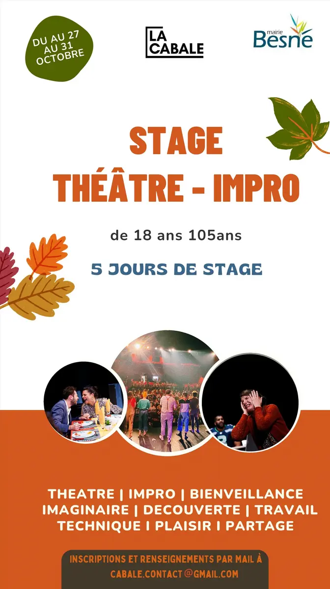 La Compagnie La Cabale renouvelle sa proposition de stages de théâtre et impro pour les vacances de la Toussaint. Inscrivez-vous par mail à [email protected].