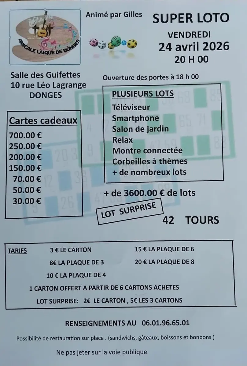 Vendredi 24 avril 2026 de 20h00 à 00h00. Salle des Guifettes, 10, rue Léo-Lagrange, Donges. Payant. Inscription avant le mercredi 22 avril. Contact : 0601966501.